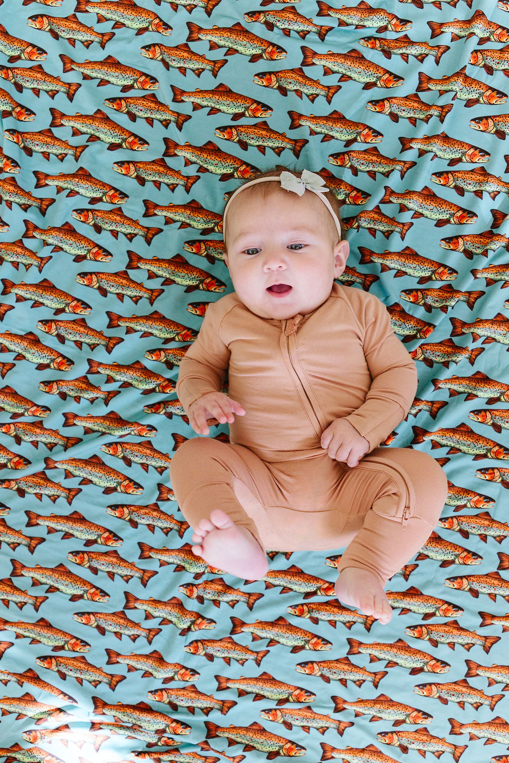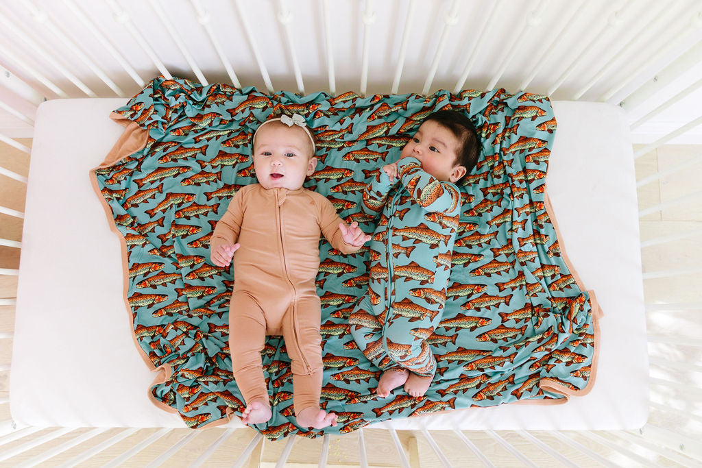 One blanket. Two vibes. This ultra-soft, oversized bamboo blanket features our bold Catch & Release trout print on one side and warm, earthy Golden Hour on the other. Cozy, reversible, and designed to go everywhere your little wild one does.