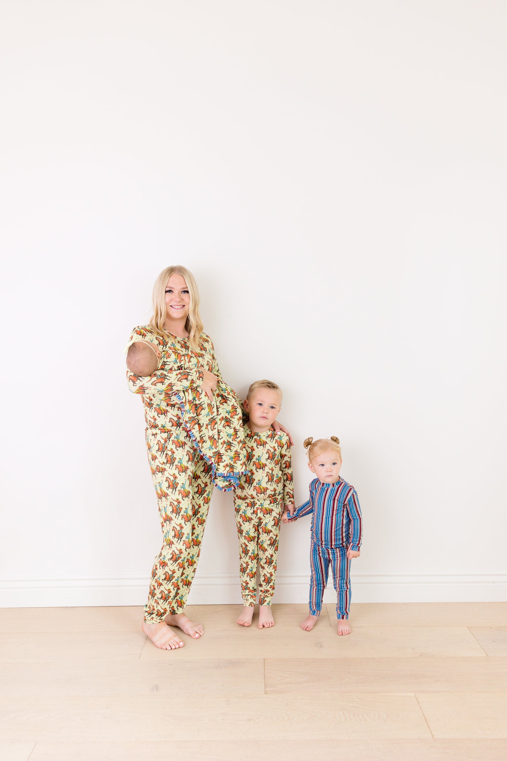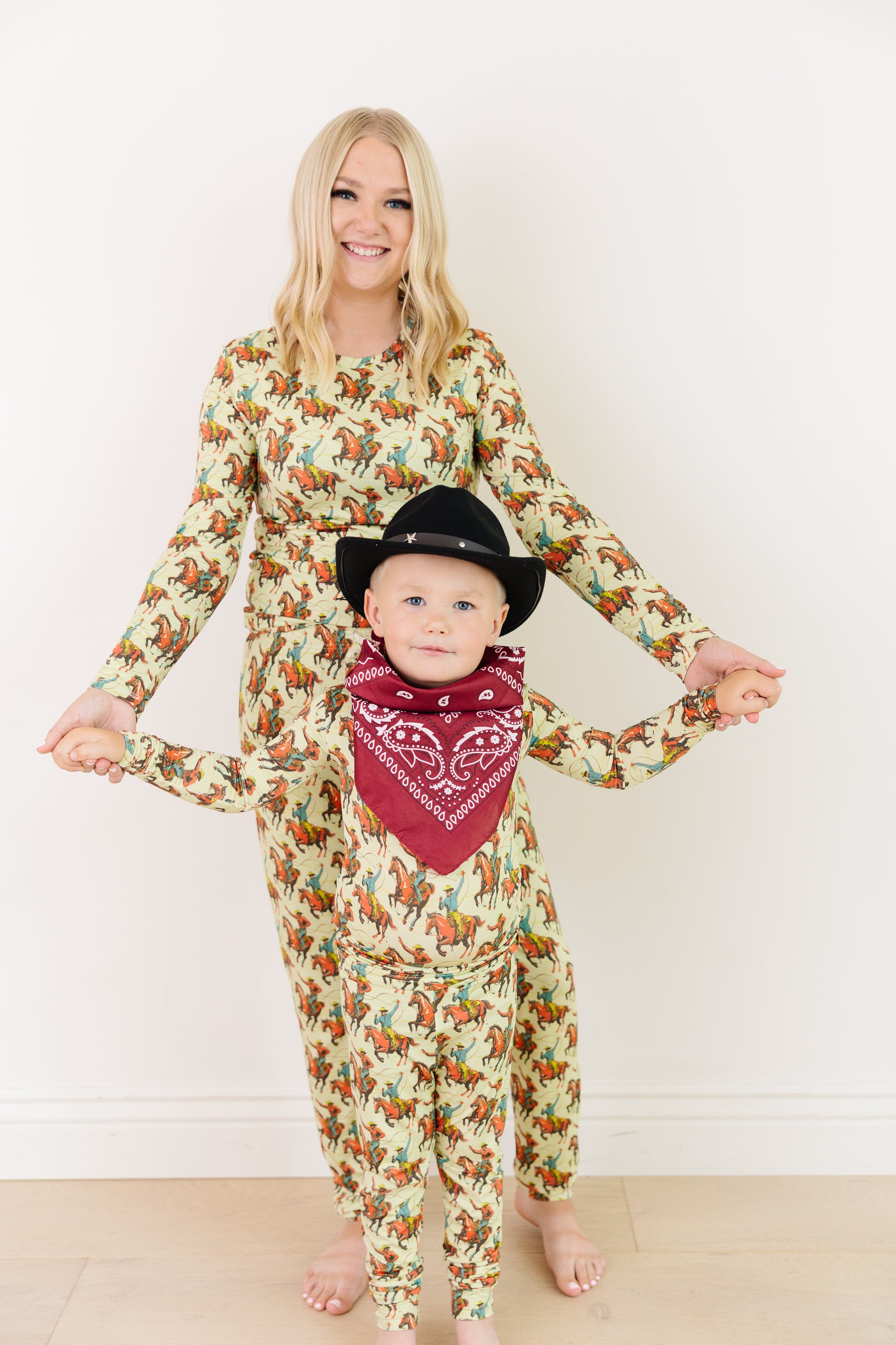 The Cowpoke adult set isn’t just for lounging — it’s built for everyday wear. The bamboo-spandex fabric delivers unmatched comfort that moves with you, keeping you cool in the heat and cozy when it cools off.